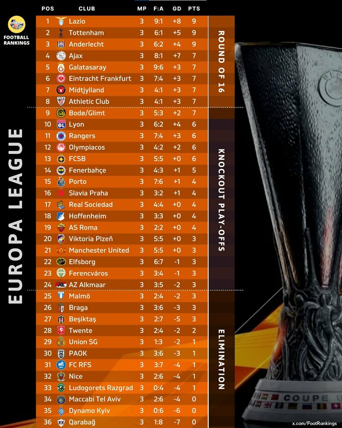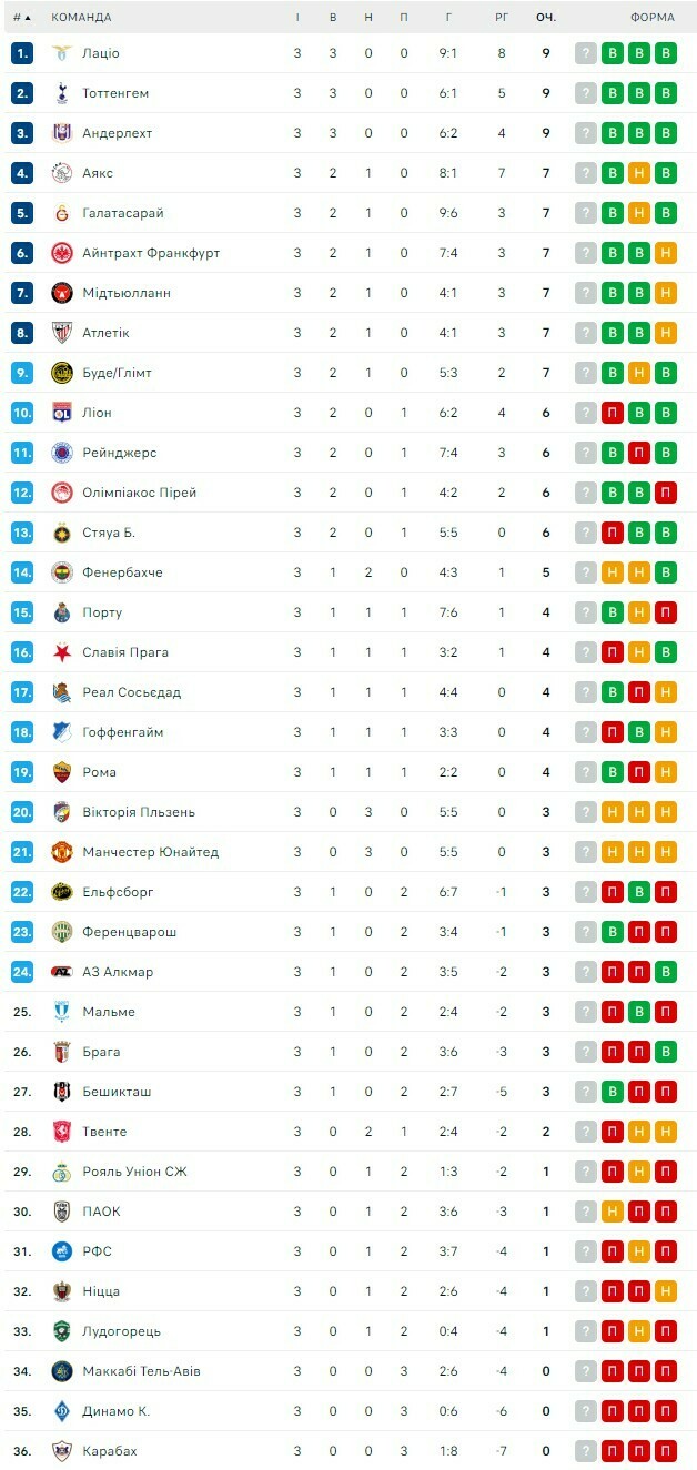 Лидируют в Лиге Европы: итальянский Лацио, английский Тоттенхэм, бельгийский Андерлехт (по 9 очков из 9).