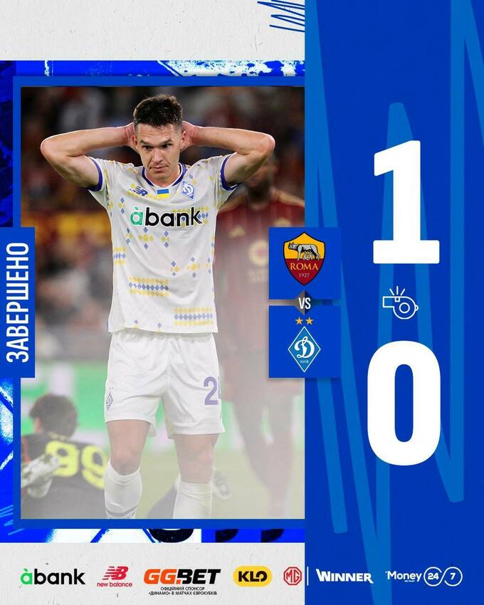 Киевское Динамо на выезде уступило итальянской Роме (0:1), единственный гол с пенальти забил украинский форвард волков Артем Довбик.