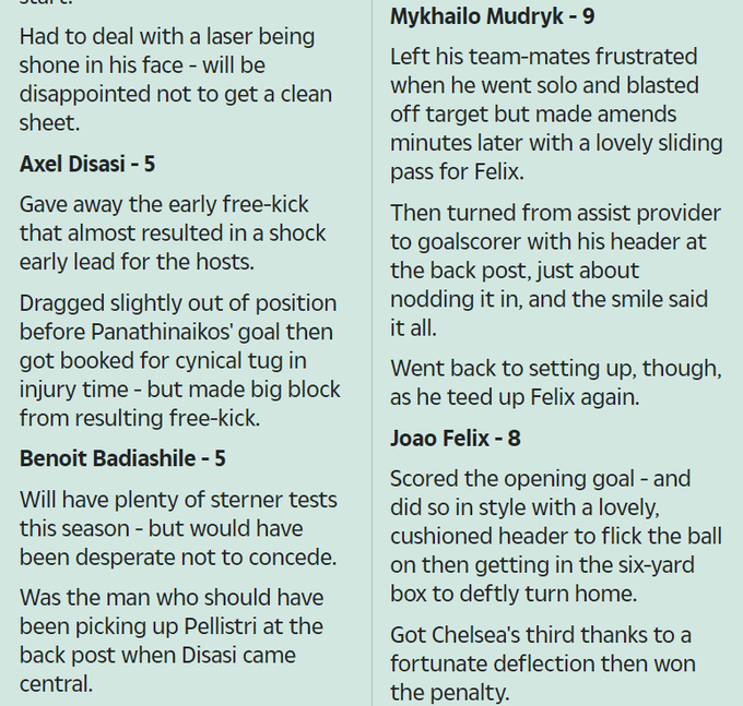 «Он разочаровал своих товарищей по команде, когда пробил мимо в одной из атак, но через несколько минут исправился, отдав прекрасный пас Феликсу. Затем он превратился из ассистента в бомбардира, пробив головой в дальний угол, и его улыбка сказала обо всем. Однако он вернулся к командным действиям, когда снова вывел Феликса на ударную позицию».