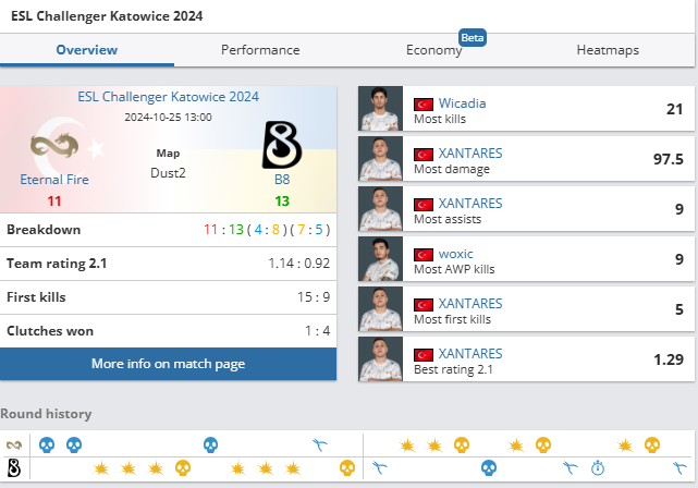 Однако, благодаря отличной командной игре и хладнокровию в решающих моментах, B8 смогли удержать преимущество и выиграть матч с финальным счётом 13:11. Больше всего убийств в матче совершил игрок B8 — Wicadia (21 килл), в то время как XANTARES из Eternal Fire стал лидером по общим показателям урона, набрав 97.5 очков.