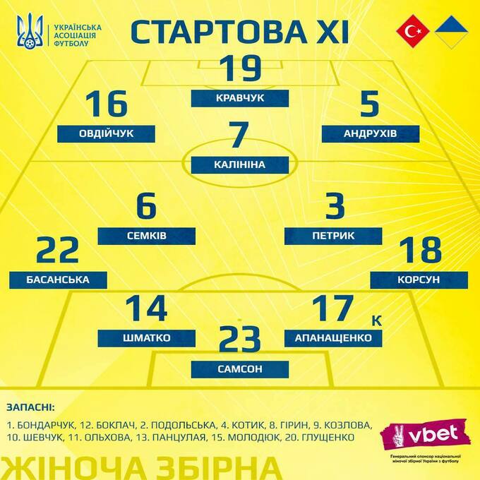 В воротах Екатерина Самсон («Ворскла»). Слева в защите Ольга Басанская («Металлист-1925»), справа Екатерина Корсун («Ворскла»). В центре будут играть Любовь Шматко («Фомгет», Турция) и Дарья Апанащенко («Металлист-1925»).