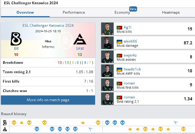 Португальская команда SAW благодаря отличной командной игре и меткой стрельбе смогла переломить ход игры и взять преимущество во второй половине. Особенно выделился игрок SAW Ag1l, который сделал больше всего убийств в матче — 19. Кроме того, roman показал лучший рейтинг (1.34) и внёс важный вклад в победу своей команды.