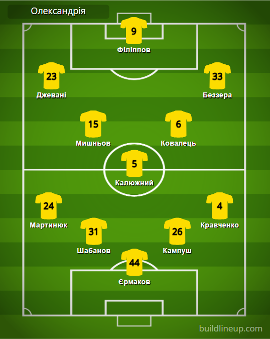«Александрия»: Ермаков – Мартынюк, Шабанов, Кампуш, Кравченко (Копина, 89) – Мишнев (Смирный, 69), Калюжный, Ковалец (Козак, 46) – Джевани, Филиппов (Кулаков, 76), Беззера (Беляев, 89).