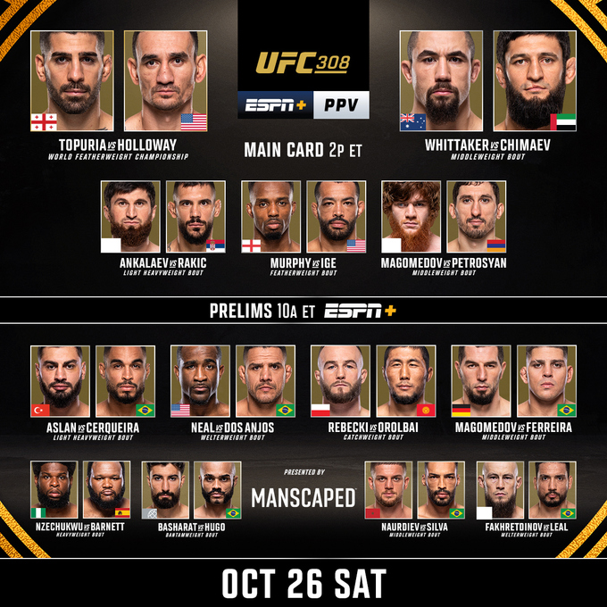 Вечером 26 октября в Абу-Даби, ОАЭ, состоится шоу UFC 308