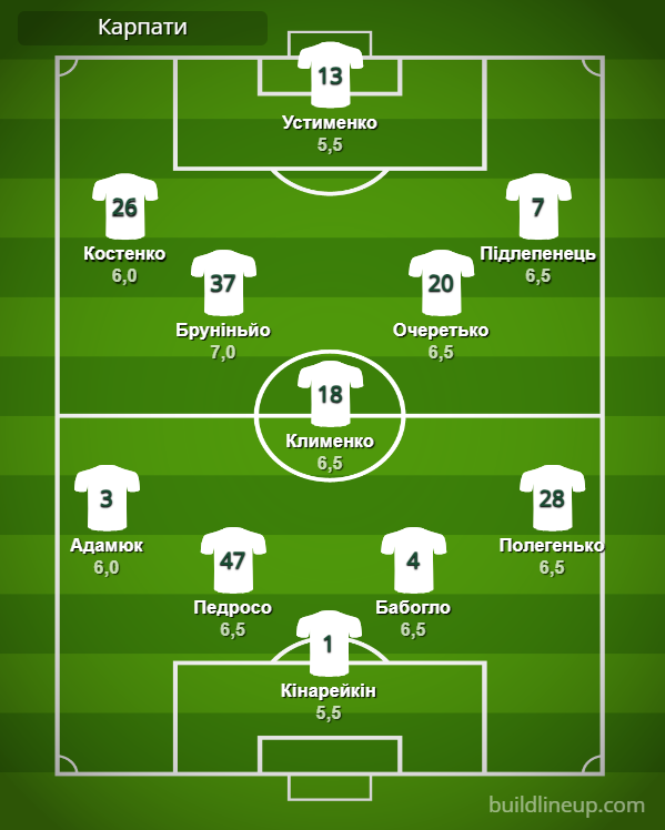 «Карпаты»: Кинарейкин – Адамюк, Педросо, Бабогло, Полегенько – Бруниньо (Шах, 76), Клименко (Рябов, 75), Очеретько (Чачуа, 62) – Костенко (Сакив, 83), Устименко (Игорь, 62), Подлепенец.