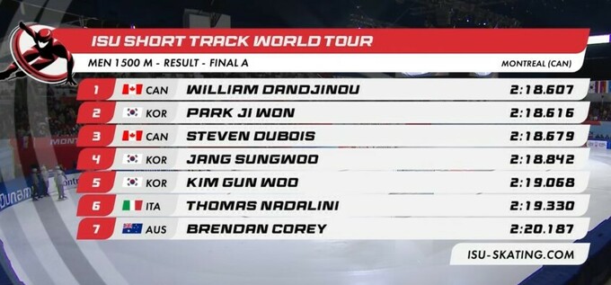 Канадский шорт-трекист Вильям Данджину выиграл первую золотую медаль Мирового тура, победив на дистанции 1500 метров на домашнем первом этапе сезона 2024/25 в Монреале.