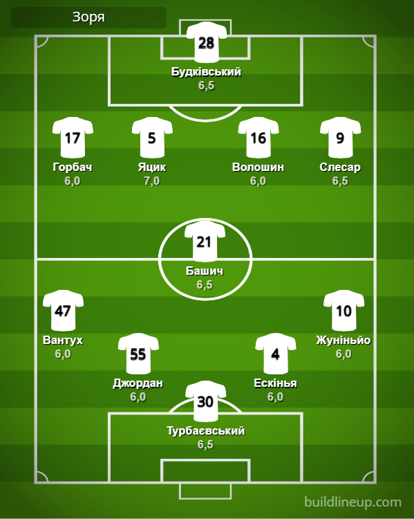 «Заря»: Турбаевский – Вантух, Джордан, Эскинья (Мичин, 46), Жуниньо (Кирюханцев, 46) – Башич – Горбач (Супряга, 66), Яцык, Волошин (Дрышлюк, 67), Слесар (Тронтель, 84) – Будковский.