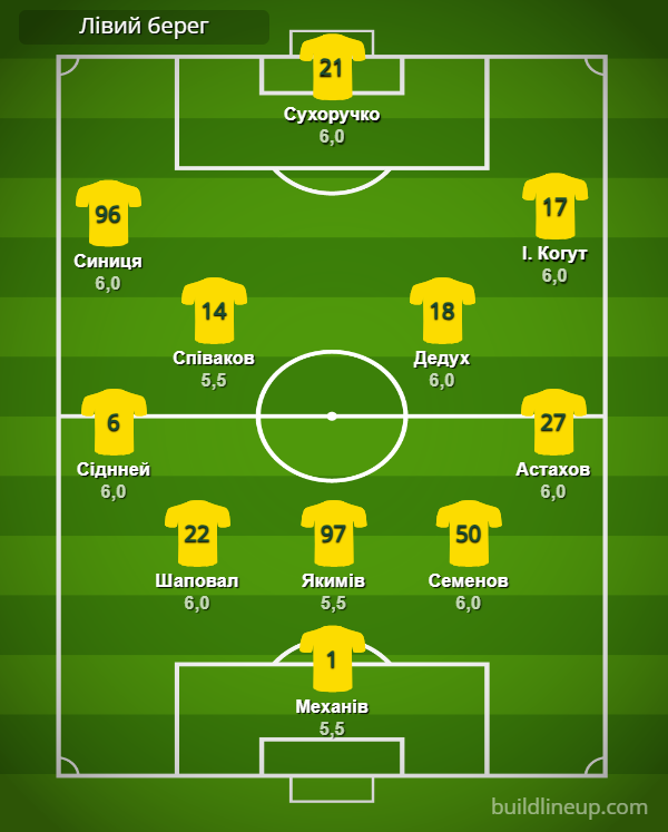 «Левый берег»: Механив – Сидней (Н. Когут, 55), Шаповал, Якимов, Семенов, Астахов – Синица (Войцеховский, 85), Дедух, Спиваков (Приходько, 46), И. Когут (Галас, 71) – Сухоручко (Кобзарь, 71).