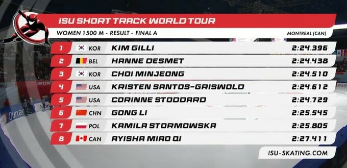 Южнокорейская спортсменка Ким Гиль Йи победила на дистанции 1500 метров на первом этапе Мирового тура шорт-трека 2024/25.