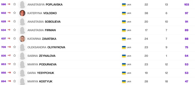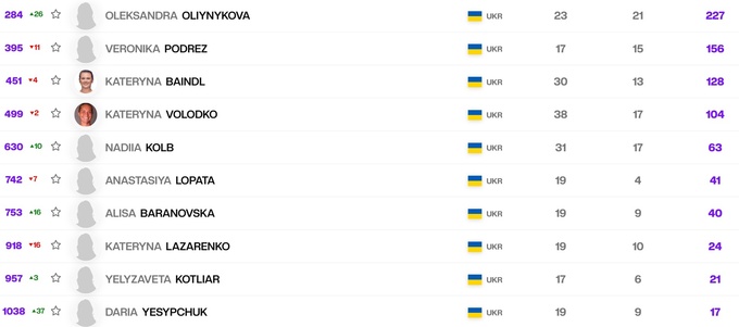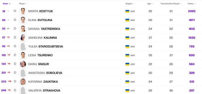 Первой ракеткой Украины остается Марта Костюк – она 18-я в мире. Небольшого прогресса добилась Даяна Ястремская, а вот из украинок в топ-300 Ангелина Калинина, Юлия Стародубцева, Леся Цуренко, Дарья Снигур, Анастасия Соболева, Катарина Завацкая, Валерия Страхова имеют минус в рейтинге. Улучшили свои позиции Александра Олейникова, Надежда Колб, Алиса Барановская и Дарья Есыпчук, у которой наибольший прогресс среди всех украинок.