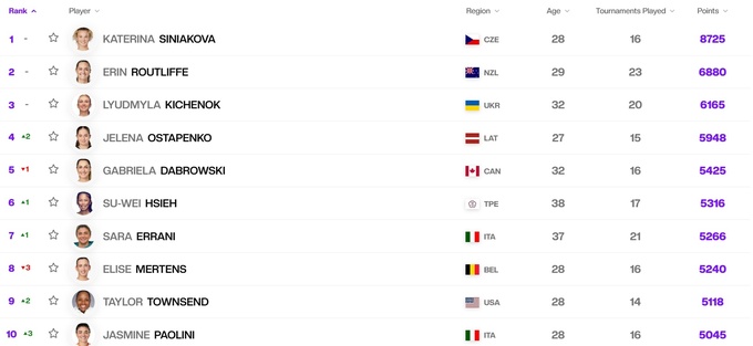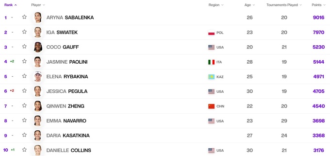 В топ-10 вошла американка Даниэль Коллинс. А вот ее соотечественница Джессика Пегула опустилась с 4-го места на 6-е. В свою очередь, 4-ю позицию теперь занимает итальянка Жасмин Паолини.