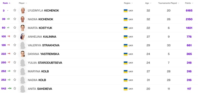 Надежда Киченок поднялась вверх на 3 позиции – она теперь 39-я в мире. Марта Костюк имеет плюс одну позицию – у нее 60-е место.