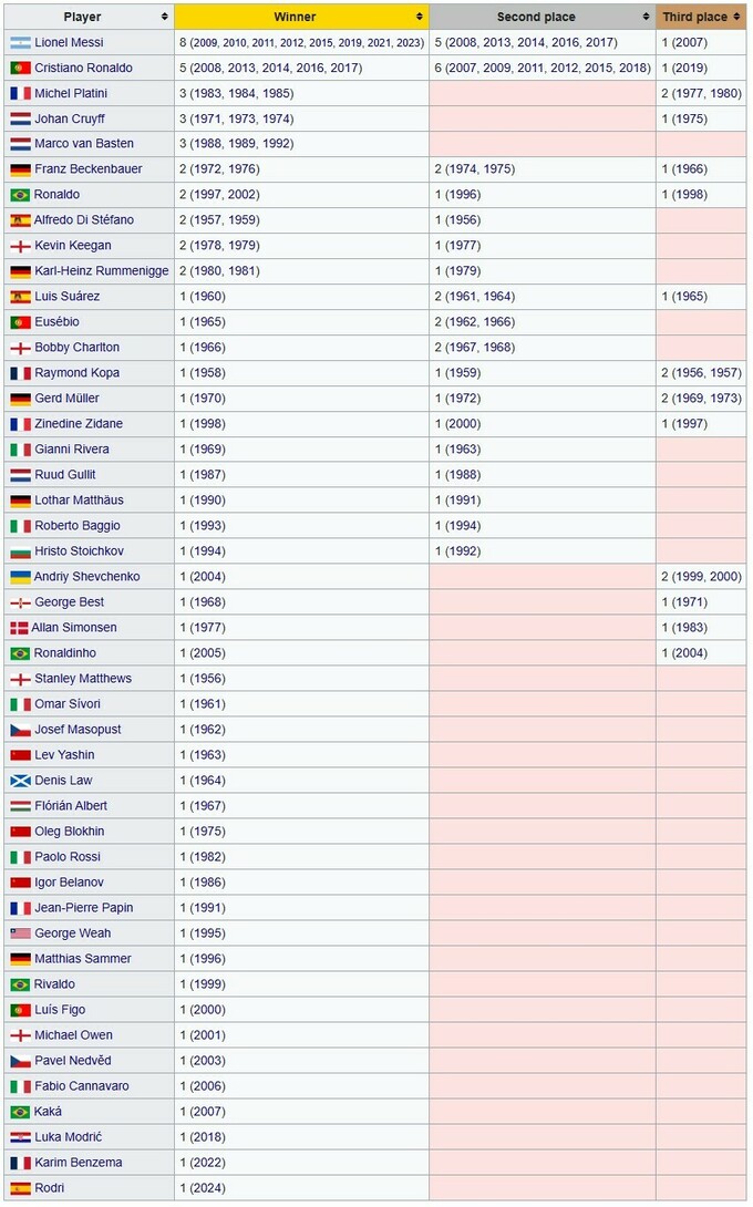 Криштиану Роналду имеет 5 Золотых мячей, по три раза приз получили Мишель Платини, Йохан Кройф, Марко ван Бастен.