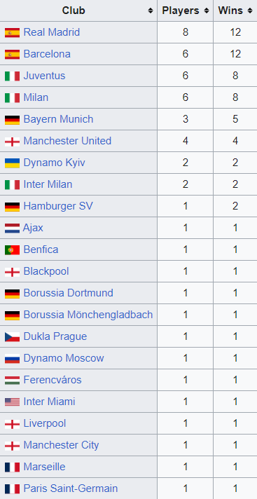 Рекорд по числу призов удерживают Реал (8 игроков) и Барселона (6 игроков) – их футболисты брали Золотой мяч по 12 раз.