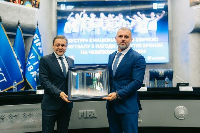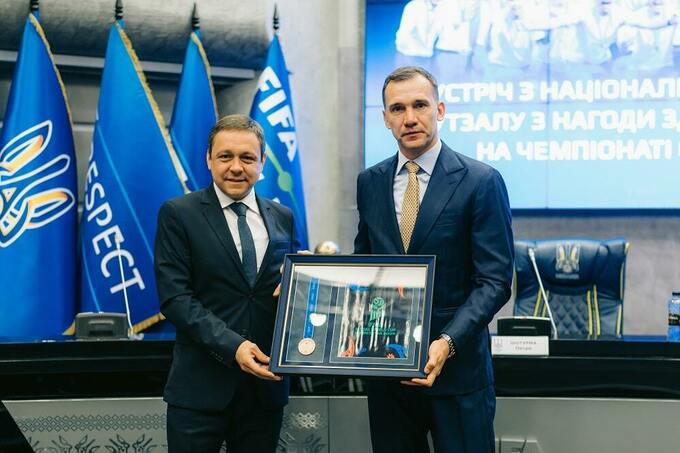 Президент Ассоциации футзала Украины Сергей Владыко вручил Андрею Шевченко и Матвею Бидному персональные бронзовые медали в благодарность за их вклад в развитие футзала и за поддержку сборной.