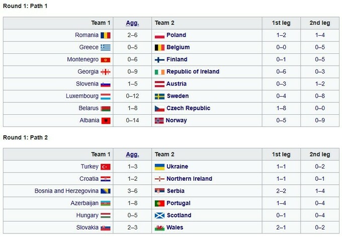 - Норвегия – Албания – 9:0 (первый матч – 5:0)