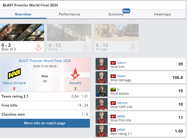 Индивидуальные показатели также были на стороне датской команды. Лучшим игроком стал stavn, который отличился наибольшим количеством убийств (39) и нанесенным уроном (106.8). Игроки Astralis полностью доминировали на сервере, отличаясь в различных категориях статистики.