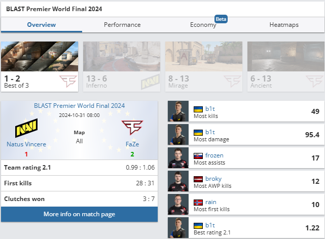 Начало матча против FaZe казалось многообещающим: NAVI уверенно выиграли первую карту Inferno со счетом 13:6. Однако на следующих двух картах, Mirage и Ancient, команда столкнулась с трудностями, проиграв 8:13 и 6:13 соответственно. Несмотря на отличную индивидуальную игру некоторых игроков, особенно b1t, который продемонстрировал лучшие показатели по количеству убийств (49) и нанесенному урону (95.4), NAVI не смогли изменить ход игры.