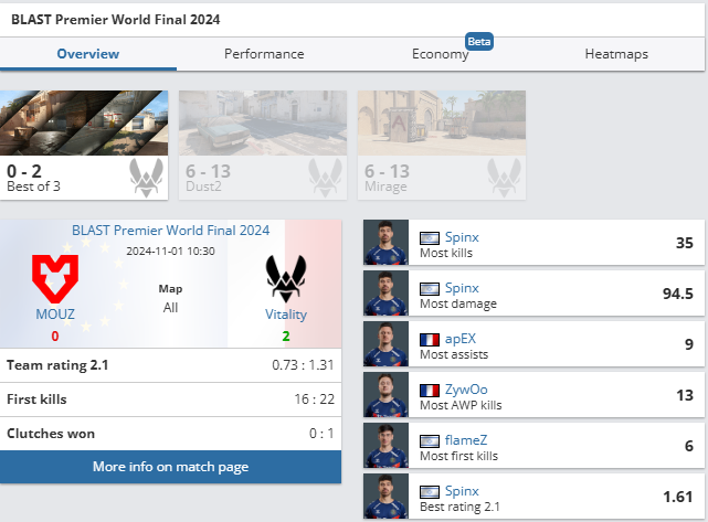 Лучшим игроком матча стал Spinx, который продемонстрировал выдающуюся игру, набрав 35 фрагов и нанеся 94.5 единиц урона. Кроме того, он показал самый высокий рейтинг 2.1 в матче — 1.61. Также свой вклад в победу Vitality внесли apEX с наибольшим количеством ассистов и ZywOo, отличившийся самым большим количеством убийств с AWP.