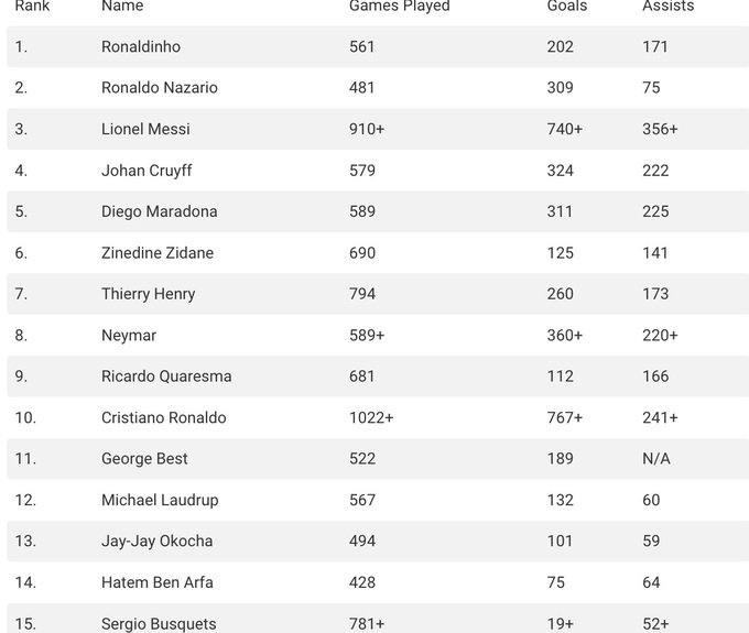 В десятку рейтинга также попали Зинедин Зидан, Тьерри Анри, Неймар, Рикарду Куарежма и Криштиану Роналду.