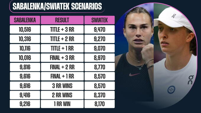 Соболенко приехала в Саудовскую Аравию с 9016 очками. С 7970 очками Свентек отстает от нее на 1046 очков. Коко Гофф, занимающая 3-е место, отстает от Соболенко на 3786 очков и явно не претендует на первую строчку.