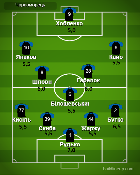 «Черноморец»: Рудько – Бутко, Жаржу, Скиба, Кисиль (Калин, 85) – Билошевский — Кайо Гомес (Пшеничнюк, 68), Шпорн (Васильев, 78), Габелок (Ермаков, 68), Янаков – Хобленко (Попов, 68)