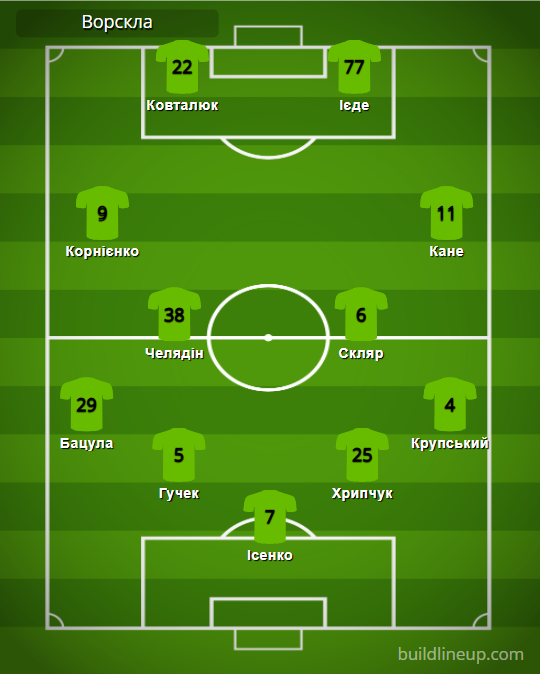 «Ворскла»: Исенко – Бацула, Гучек, Хрипчук (Изотов, 89), Крупский – Корниенко (Нестеренко, 46), Челядин, Скляр, Кане – Ковталюк (Ндукве, 46), Иеде.