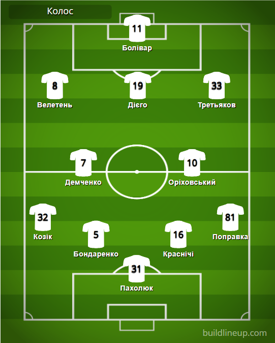 «Колос»: Пахолюк – Козик, Бондаренко, Красничи, Поправка – Демченко, Ореховский – Велетень (Алефиренко, 74), Диего (Салабай, 58), Третьяков (Гусол, 74) – Боливар (Безбородько, 88).