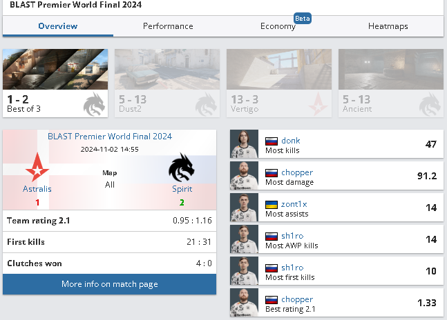 Лучшим игроком матча стал chopper из команды Spirit, который набрал рейтинг 1.33 и внёс значительный вклад в общий урон (91.2). Вместе с sh1ro и zont1x он обеспечил команде уверенную победу в важных клатч-раундах.