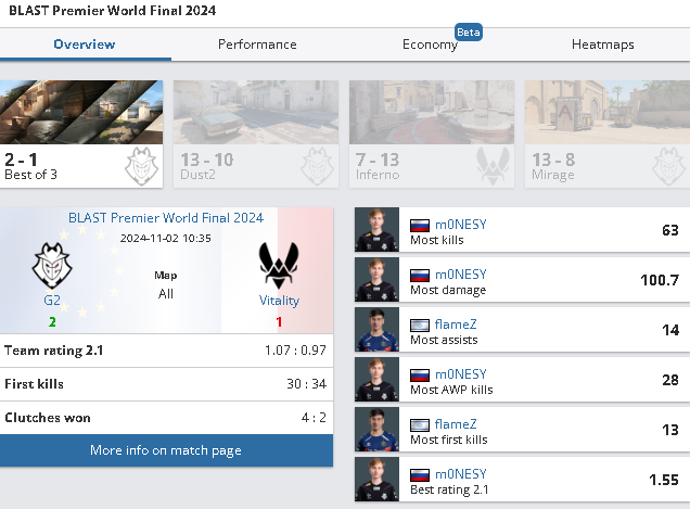 Самым ярким игроком матча стал m0NESY из команды G2. Его статистика впечатляет: 63 фрага, наибольший урон за игру (100.7) и рейтинг 1.55. Он сделал больше всего AWP-убийств, что существенно повлияло на результат.