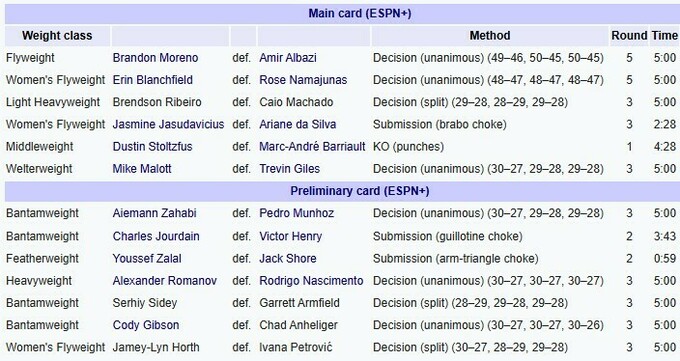 Мексиканский боец Брендон Морено одержал победу над Амиром Альбази единогласным решением судей. Морено доминировал на протяжении всего поединка, продемонстрировав высокое техническое мастерство и отличную тактическую подготовку.