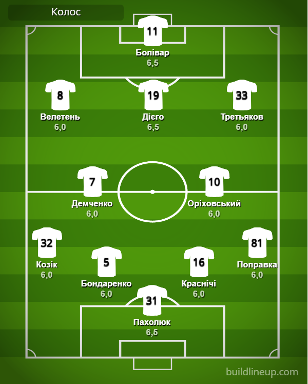 «Колос»: Пахолюк – Козик, Бондаренко, Красничи, Поправка – Демченко, Ореховский – Велетень (Алефиренко, 74), Диего (Салабай, 58), Третьяков (Гусол, 74) – Боливар (Безбородько, 88).