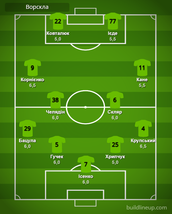 «Ворскла»: Исенко – Бацула, Гучек, Хрипчук (Изотов, 89), Крупский – Корниенко (Нестеренко, 46), Челядин, Скляр, Кане – Ковталюк (Ндукве, 46), Иеде.