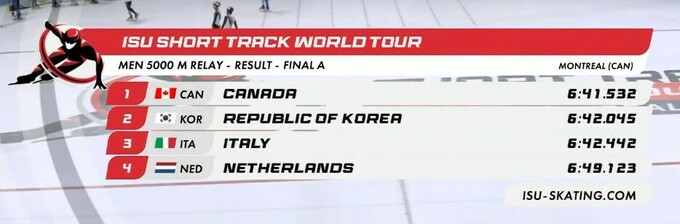 Канадские спортсмены Вильям Данджину, Стивен Дюбуа, Жордан Пьер-Жиль и Феликс Руссель победили в мужской эстафете, которая закрывала программу домашнего второго этапа Мирового тура шорт-трека 2024/25.