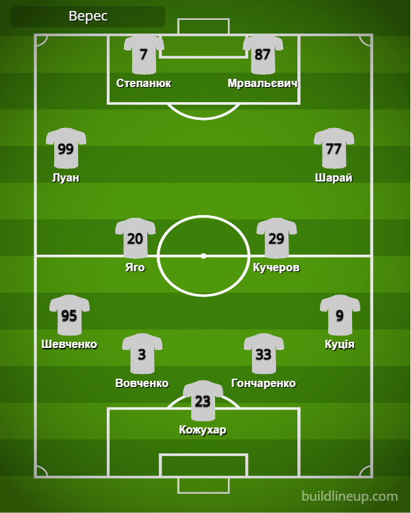 «Верес»: Кожухарь – Шевченко, Вовченко, Гончаренко, Куция – Яго (Клец, 72), Кучеров – Луан (Нонго, 89), Шарай (Годя, 64) – Мрвалевич (Гайдучик, 65), Степанюк (Дахновский, 65).
