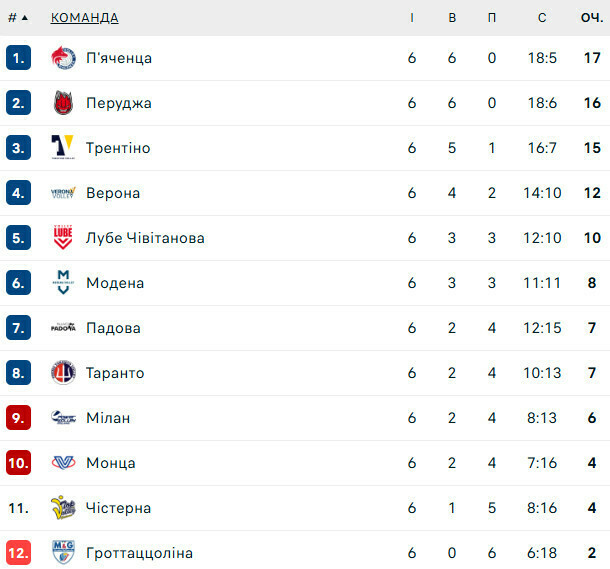 Так же, как у «Перуджи», шесть побед в шести матчах у «Пьяченцы», которая в шестом туре победила 3:0 «Милан».