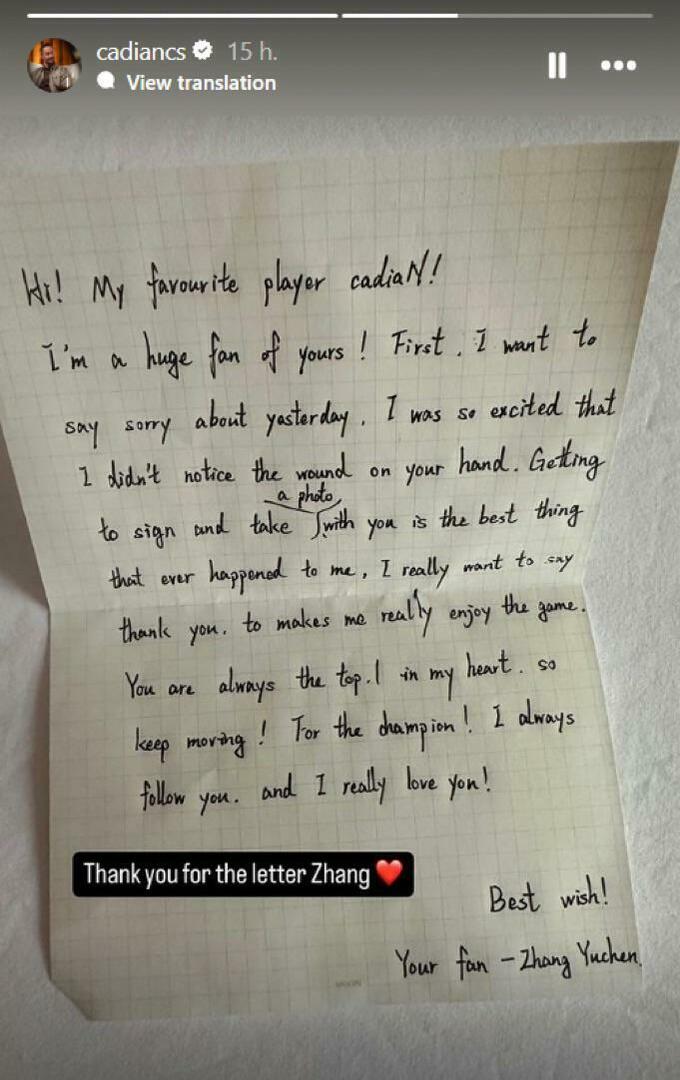 «Привет, мой любимый игрок cadiaN! Я твой большой поклонник. Прежде всего, хочу извиниться за вчерашнее. Я был так взволнован, что не заметил раны на твоей руке. Получить автограф и сфотографироваться с тобой – это лучшее, что когда-либо случалось со мной. Я действительно хочу сказать тебе большое спасибо. Благодаря тебе я получаю настоящее удовольствие от игры. Ты всегда топ-1 в моем сердце. Так что продолжай идти к чемпионству! Я всегда слежу за тобой и очень тебя люблю».