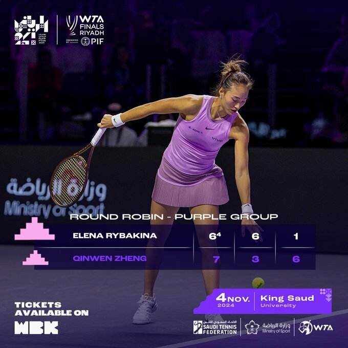 Во 2-м туре Фиолетовой группы китаянка в трех сетах переиграла Елену Рыбакину (Казахстан, WTA 5) за 2 часа и 27 минут.