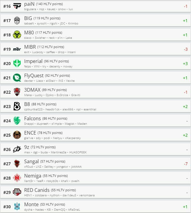 Первую десятку замыкают FaZe на шестом месте с 394 баллами и Eternal Fire с 321 баллом. Heroic и FURIA занимают восьмое и девятое места, а Virtus.pro дополняет топ-10 с 259 баллами. Далее идут The MongolZ на 11 месте, Liquid на 12, Astralis на 13, Complexity на 14, а SAW завершает топ-15.