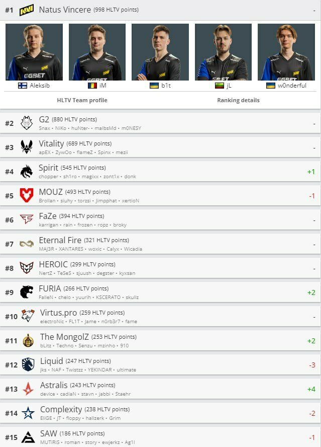 - G2 с 880 баллами остаются на втором месте, имея в составе таких звёзд, как NiKo и m0NESY. Эта европейская команда держится на высоких позициях благодаря мощному составу и стабильной игре.
