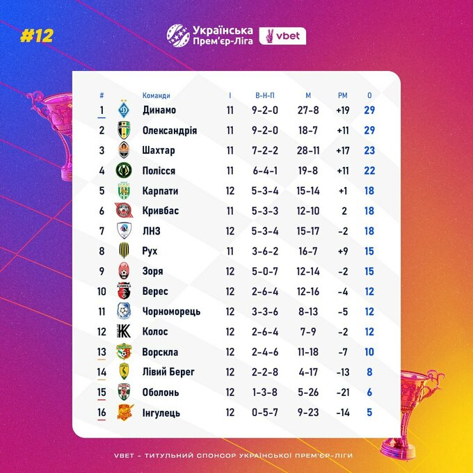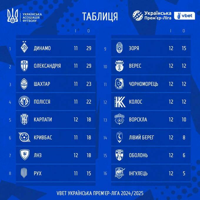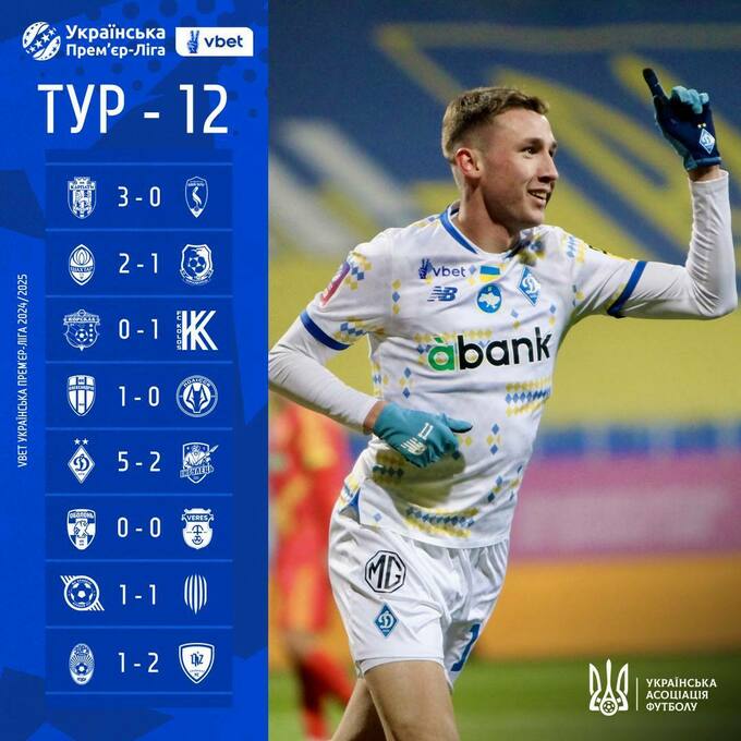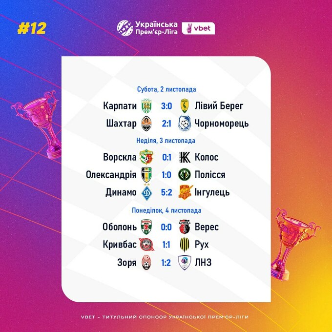 С 2 до 4 ноября прошли матчи 12-го тура Украинской Премьер-лиги 2024/25.