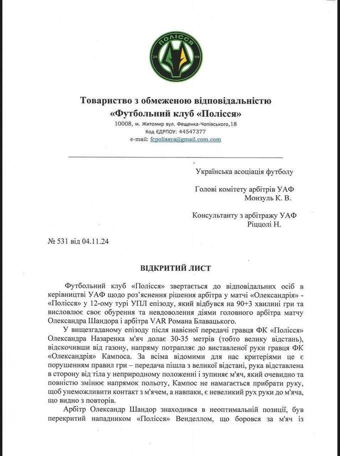 Житомирское «Полесье» обратилось к Украинской ассоциации футбола касательно спорного эпизода на последних минутах в гостевого матча против «Александрии» в рамках 12-го тура УПЛ.