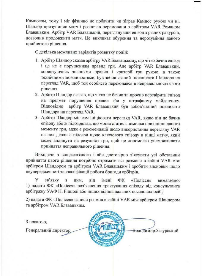 «Полесье» просит ассоциацию предоставить объяснения момента от консультанта арбитража УАФ Николы Риццоли. Также клуб попросил предоставить записи разговоров арбитров во время эпизода.
