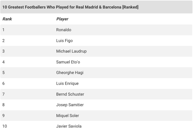 Известный британский портал GiveMeSport обнародовал рейтинг лучших футболистов, которые выступали за «Барселону» и «Реал».