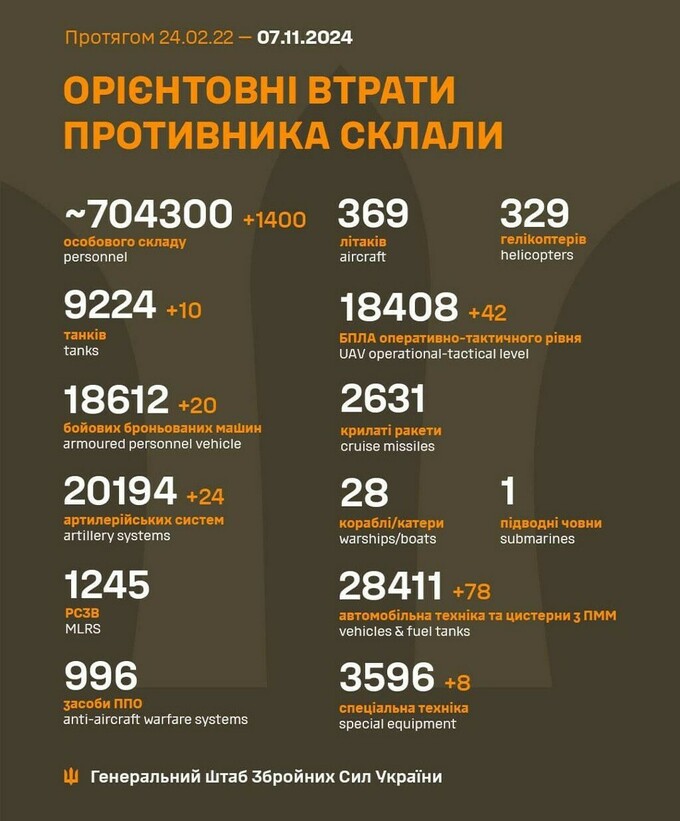 Предлагаем вашему вниманию сведение общих боевых потерь россии с 24.02.2022 по 07.11.2024.