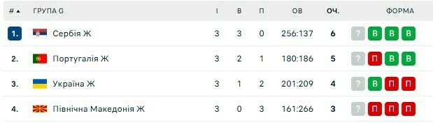 Сборная Украины одержала первую победу и вышла на третье место в группе. Лидируют Сербия (3 победы) и Португалия (2 выигрыша).