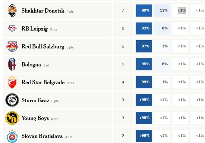Шансы Шахтера финишировать в топ-8 и выйти сразу в 1/8 финала оцениваются менее чем в 1%. А вот выйти в плей-офф (финиш с 9-й по 24-ю позиции) команда может с 11% шансами.
