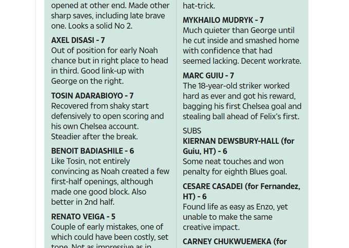 Мудрик получил 7 баллов и такой комментарий: «Играл гораздо тише, чем Джордж, пока он не прорвался в центр и не пробил с уверенностью, которой, казалось, ему не хватало. Приличная работоспособность».