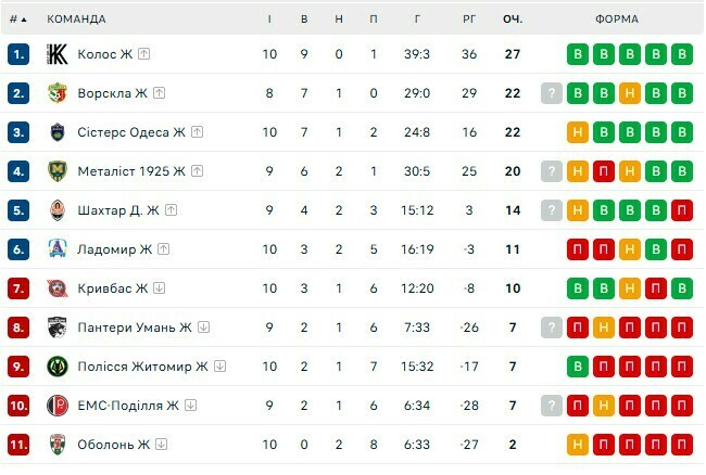 Топ-шестерка: Колос (27), Ворскла (22), Систерс (22), Металлист 1925 (20), Шахтер (14), Ладомир (11).