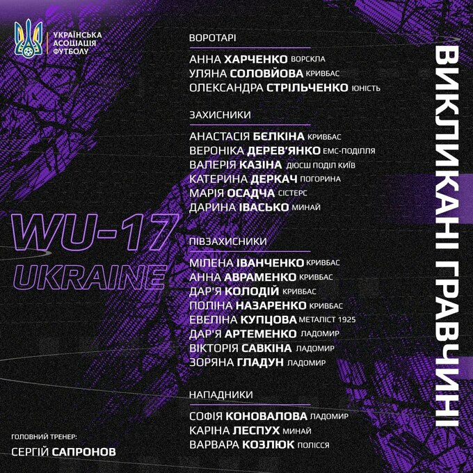 Главный тренер девичьей сборной Украины WU-17 Сергей Сапронов обнародовал список из 20 футболисток, вызванных на учебно-тренировочный сбор.